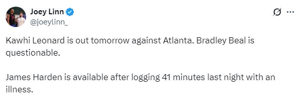 北京时间11月10日,NBA常规赛继续进行,快船官方公布下一场对阵老鹰的伤病报告,科怀-莱昂纳德因脚踝扭伤继续休战,生病的哈登将继续出战。