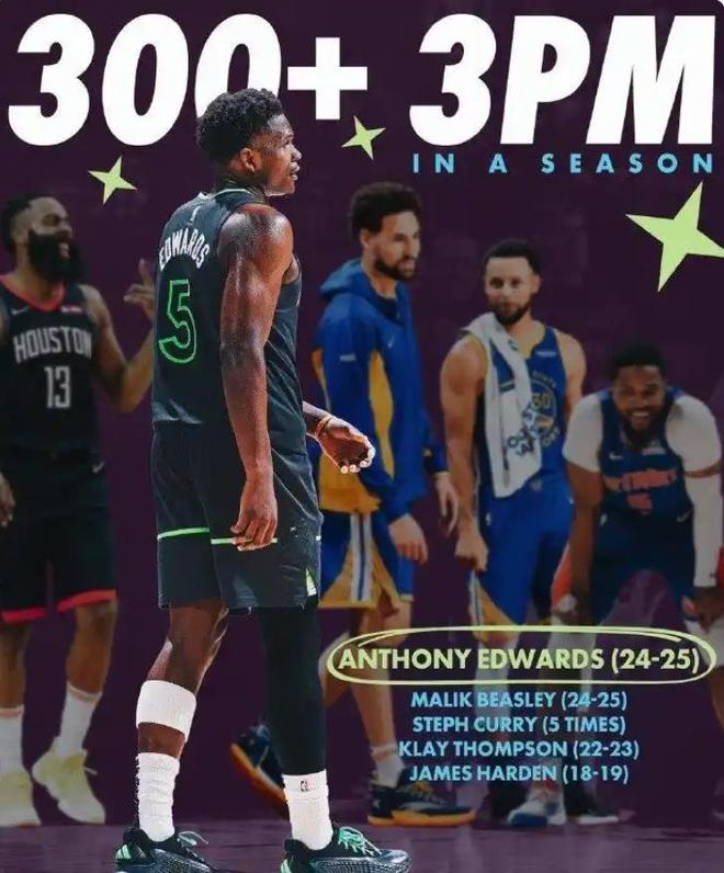 如果库里新赛季能够出战65场~70场比赛的话,他就有可能重登三分宝座,上赛季的“三分王”被爱德华兹摘得(出战了79场比赛,命中320记三分),位列第二的是比斯利(打满了82场比赛,命中了319记三分球)。