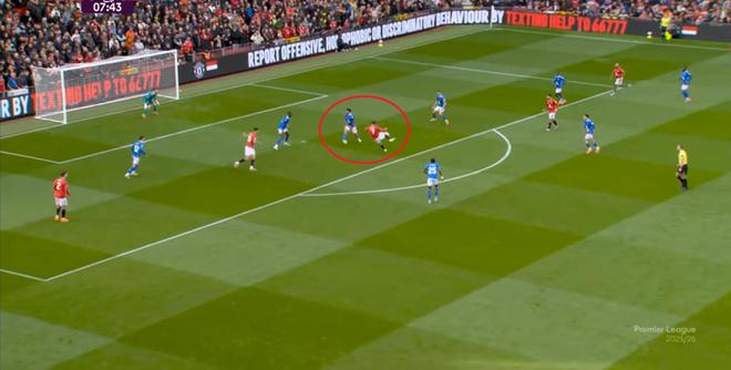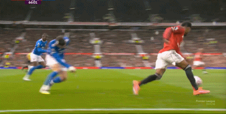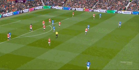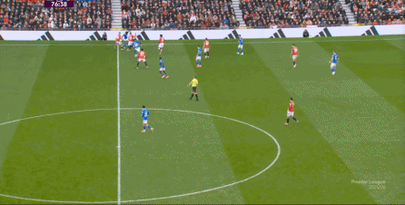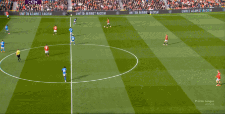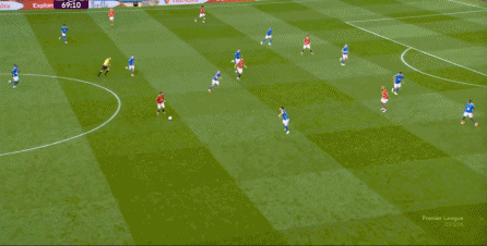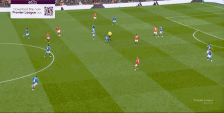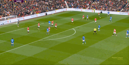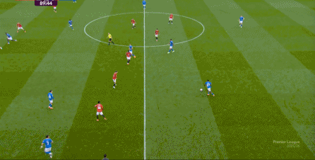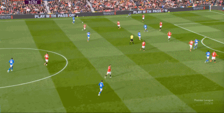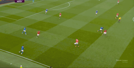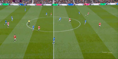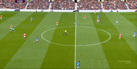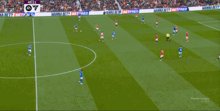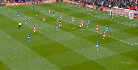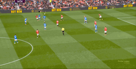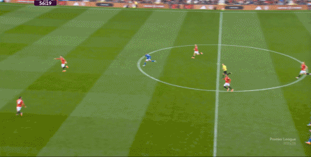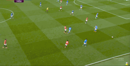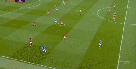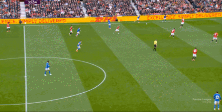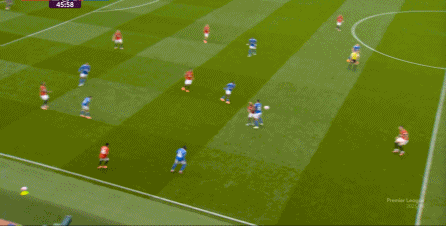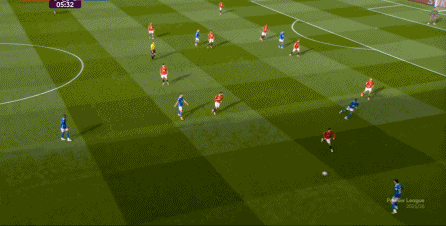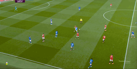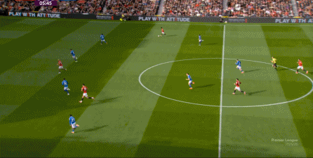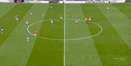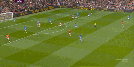 这一球实际上展现了三后卫体系在对阵四后卫时的优势,那就是对方的边路球员一旦选择上前压迫曼联的边中卫,那么曼联的翼卫位置就会进入天然的空当里,所以理论上接球很顺畅,接下来就可以用5人打对方的4人后卫线: