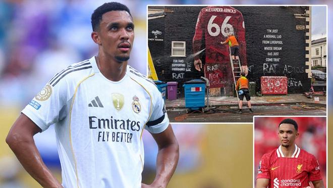 比赛开始前,有画面显示,安菲尔德附近的阿诺德壁画遭到了涂鸦,他被贴上了“叛徒”的标签。