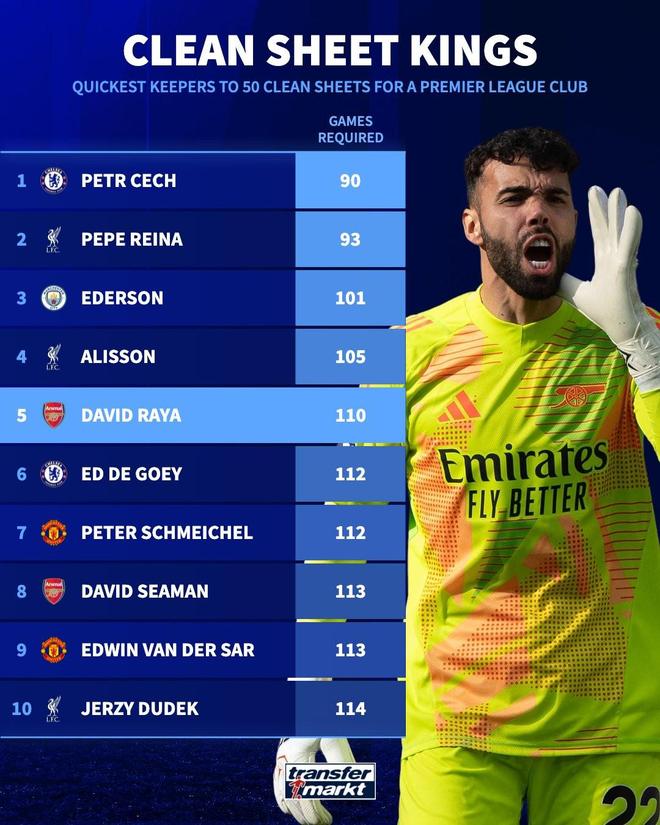 北京时间11月5日,阿森纳在欧冠联赛阶段第4轮的比赛中客场3-0击败了布拉格斯拉维亚,此战也让戴维-拉亚达成了自己为枪手零封50场的里程碑,对此德转则统计了为单一英超俱乐部零封50场所用场次最少的10位门将,切尔西的传奇门将切赫排名第一,戴维-拉亚位列第五。