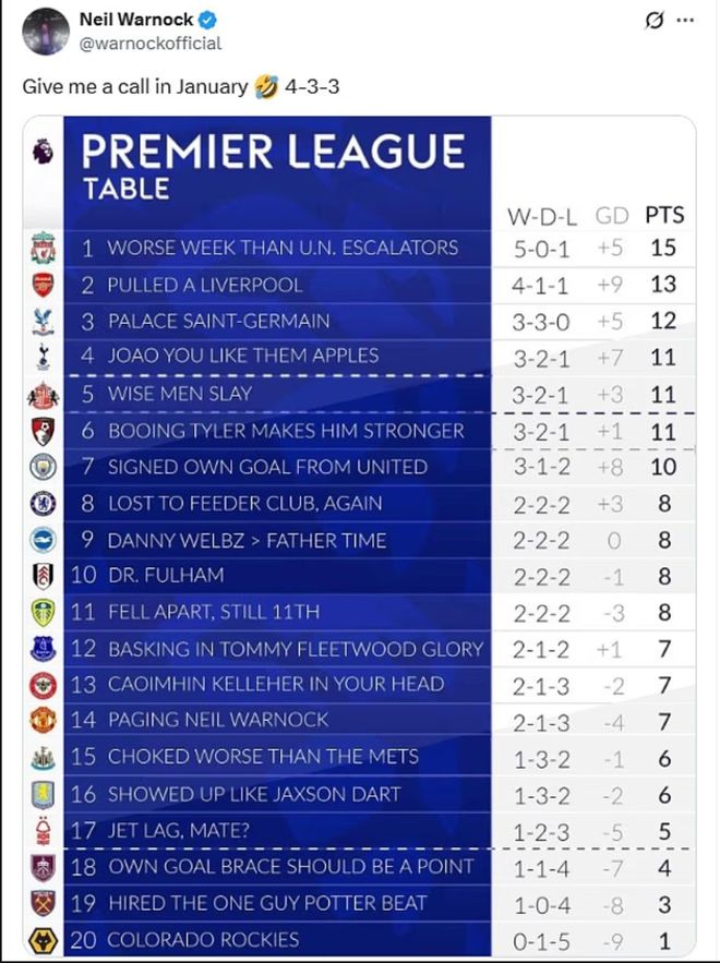 雷速体育10月2日讯 76岁的传奇救火教练尼尔·沃诺克通过社媒(X)发布一份动态,对英超各队的近况进行了调侃。他还用“一月份给我电话”来开玩笑,表示如果曼联解雇阿莫林,他会复出执教红魔。
